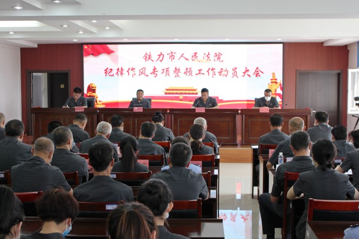 为全面贯彻全市法院工作会议精神,加强全院队伍思想和纪律作风建设,持续推进法院各项工作向好发展,近日,铁力市人民法院召开纪律作风专项整顿工作动员会,铁力市法院班子成员,各庭、室、局、人民法庭全体干警参加会议。