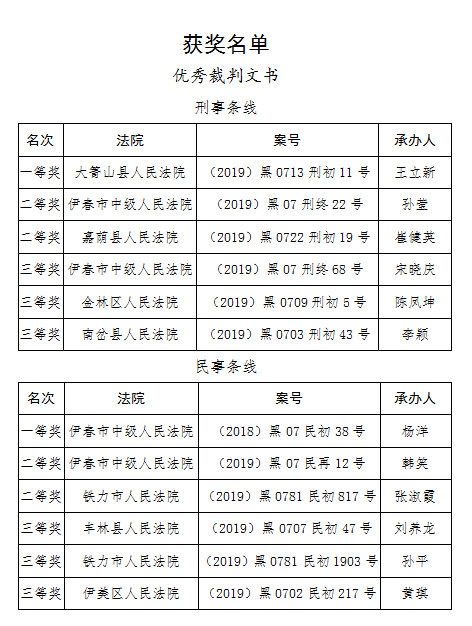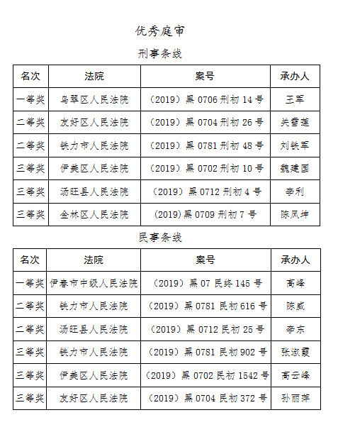 伊春中院组建了由业务院长、各庭庭长及资深法官为评委的司法业务评比小组,对两级法院选送的45篇优秀裁判文书和22场优秀庭审,进行认真评选、审核,分别评选出优秀裁判文书一等奖2名,二等奖4名,三等奖6名;优秀庭审一等奖2名,二等奖4名,三等奖6名。
