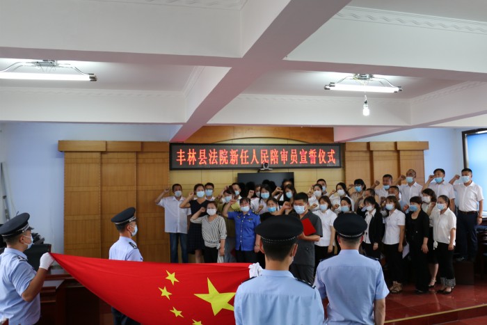 在宣誓仪式上,39名人民陪审员在丰林县法院副院长荣华的领誓下,面向国旗庄严宣誓:“我是中华人民共和国人民陪审员,我宣誓:忠于国家,忠于人民,忠于宪法和法律,依法参加审判活动,忠实履行陪审职责,廉洁诚信,秉公判断,维护社会公平正义!”表达了对宪法的忠诚、对法律的敬仰,对责任的敬畏。