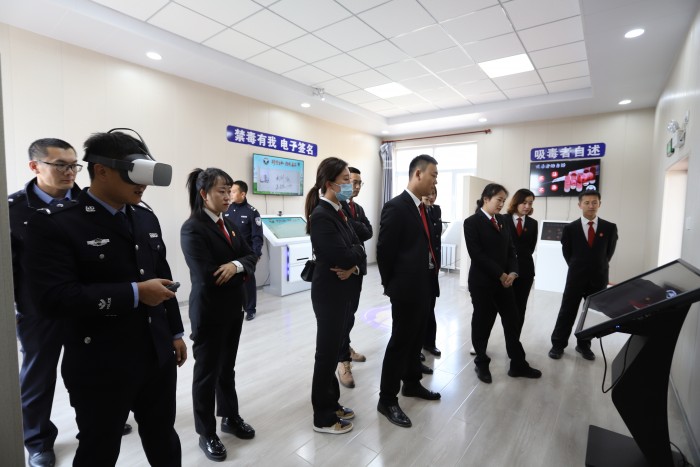 在禁毒教育基地工作人员的带领下,干警们参观了展览厅,通过图片、视频、实物、真实案例、VR互动等方式对禁毒的历史、毒品的特征、毒品的危害有了全方位地了解。