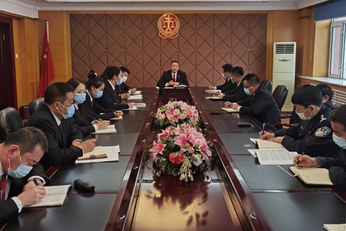 1月12日下午,伊春市中级人民法院第六党支部召开党员扩大会议,党组成员、执行局局长、第六党支部书记冯久鸿主持会议,第六支部全体党员、执行局全体干警参加会议。