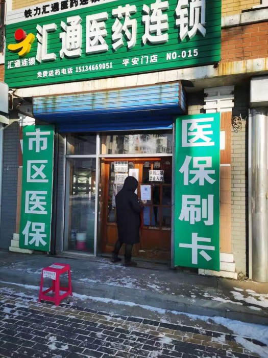 在向阳社区所在的汇通药店门前,看护药店组正在督促药店是否落实扫码、测温、戴口罩,销售“退烧止咳抗病毒”药品是否落实凭身份证实名登记,并要求营业室每天至少三次全面消杀和一次人员晨检。