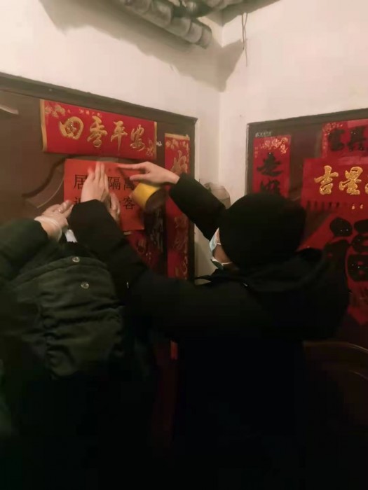 隔离组严格落实居家隔离五级包保任务,正在为省外及疫情重灾地区返乡人员履行居家隔离流程并张贴封条。同时与社区网格长、隔离人员建立微信群,每天至少两次采取门前查看、电话访、微信视频访、微信共享实时位置等措施,随时了解掌握隔离人员是否做到居家隔离不出门,是否做到亲朋好友不上门,并填报随访记录、便民记录、负责监测体温、隔离检查、隔离服务。
