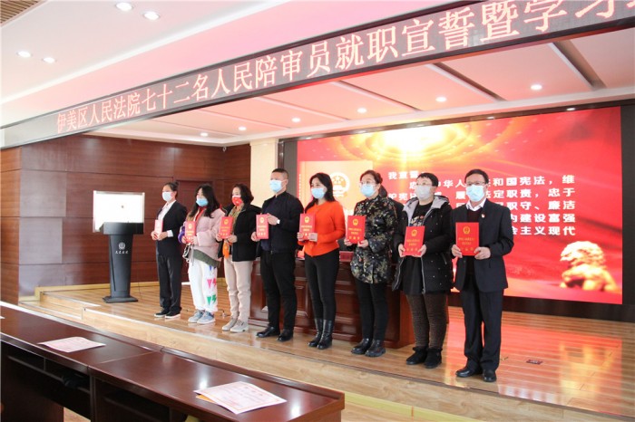 会上,伊美区法院副院长黄瑛琳向新任命人民陪审员颁发了任命证书。随后,新任命人民陪审员全体起立,奏唱国歌,在邹海涛同志的领誓下,他们右手举拳,面向国旗,庄严宣誓。