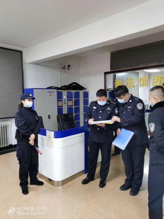 3月4日上午,伊春市中级人民法院法警支队负责人赵志浩一行人对伊春市友好区人民法院上甘岭法庭和道北法庭督导检查警务工作,排查安全隐患。