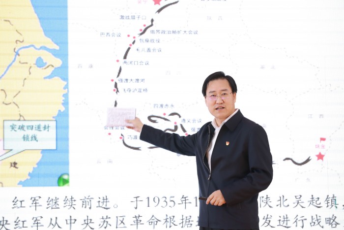 韩日强院长以毛泽东主席在中国革命时期的诗词为引导,生动讲述了中国共产党领导中国人民进行中国革命夺取中国新民主主义革命胜利,建立新中国的历史过程。在讲述过程中,韩日强院长朗诵了毛主席在不同革命时期的十几首经典诗词并旁征博引了许多古今诗章典故,在他铿锵有力的诵读中,引导听课干警重温了那段血雨腥风的峥嵘岁月,回顾了那些改变中国革命的重大历史事件,愐怀了感人至深的英雄人物和事迹,从中学习革命先辈不怕牺牲、甘于奉献、不屈不挠、敢于胜利的革命英雄主义精神。通过对中国共产党领导的中国革命历程、英烈人物和事迹的回顾,激励干警树立崇高理想、远大志向和革命情怀。在1个半小时的讲授过程中,韩日强院长站立讲台,情绪始终饱满激昂,用实际行动为市法院党员领导干部讲党课树立了榜样作出了表率,有力推动市法院队伍教育整顿和党史教育向纵深发展。