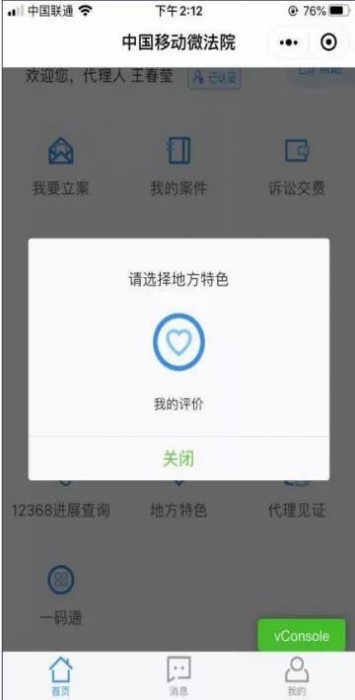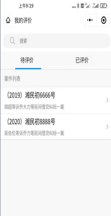 当事人在微法院注册登陆后,点击首页“地方特色”模块,选择“我的评价”,点击跳转至评价列表页面,用户在待评价表中选择案件,跳转之“我要评价”页面,进行勾选评价。