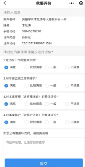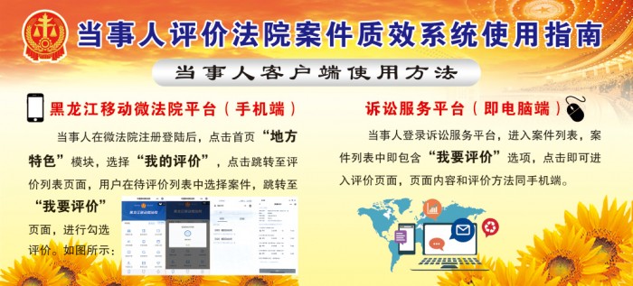 为切实提升人民群众司法满意度,及时评估法院、法官审判质效情况,黑龙江省法院研发了“当事人评价法院案件质效系统”,并在黑龙江移动微法院和诉讼服务平台上予以开通。这也是深入贯彻落实政法队伍教育整顿工作,扎实开展“我为群众办实事”的重要实践活动。现将“当事人评价法院案件质效系统”使用方法予以公布。