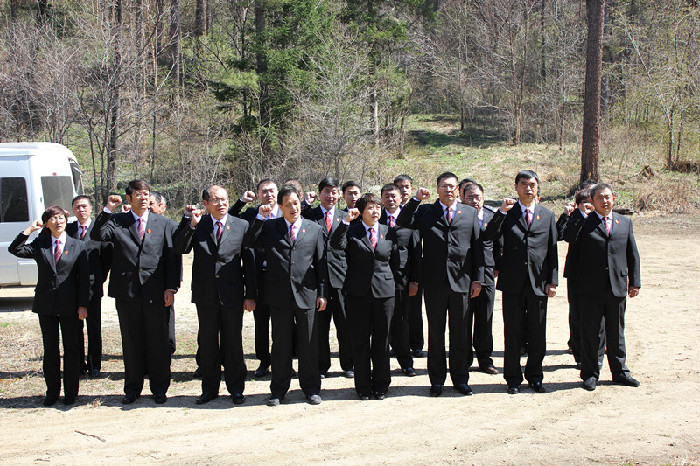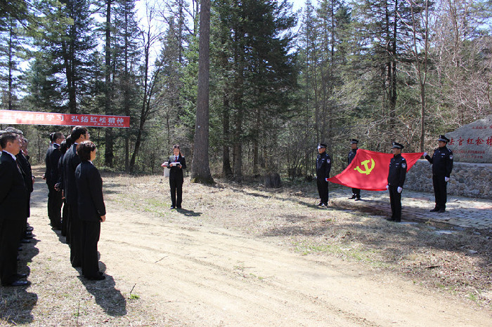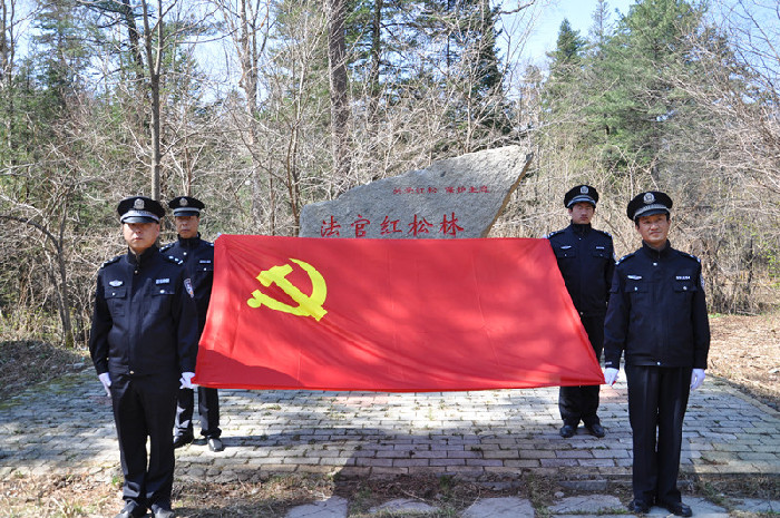 在朗乡林业局清源林场,全体集中封闭学习干警不顾车旅疲惫,整齐严肃地站在 “法官红松林”纪念碑前,面向党旗庄严地举起右手,激昂高亢地重温着“入党誓词”和“法官誓词”,承诺着他们坚持司法为民、公正司法的理想信念和价值追求。