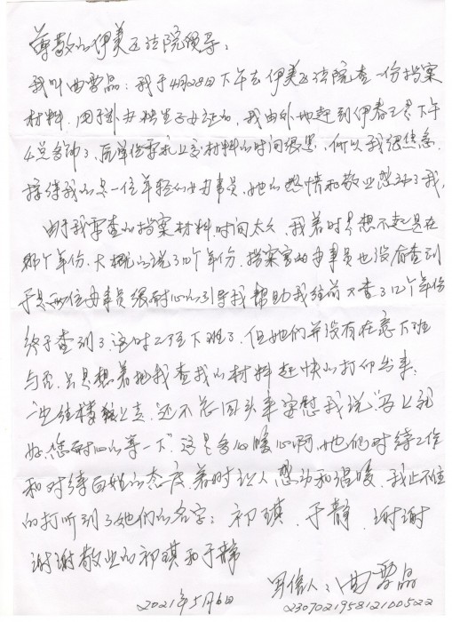 我叫曲雪晶,我于4月28日下午去伊美区法院查一份档案材料,用于补办独生子女证明。我由外地赶到伊春已是下午四点多钟了,原单位要求上交材料的时间很紧,所以我很焦急,接待我的是一位年轻的女办事员,她的热情和敬业感动了我。