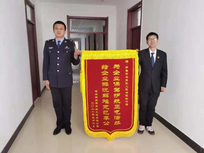 为表达感谢之情,5月6日,申请执行人哈尔滨XX工程有限公司为执行局送来了一面写着“为企业保驾护航,给企业排忧解难”的锦旗。鲜红的锦旗承载的是当事人对执行干警执法迅速,办案公正的认可,也是对执行干警为民办事为民解忧的鞭策和激励。