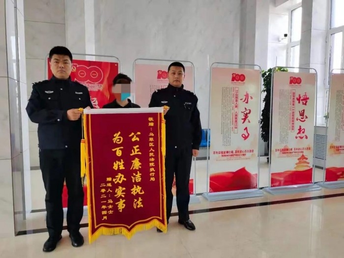 4月26日下午,马某某怀着激动的心情将一面“公正廉洁执法、为百姓办实事”的锦旗送到伊春市乌翠区法院执行局,马某某对案件的执行干警尽职尽责、热情周到的服务表示了高度的赞扬和诚挚的感谢。