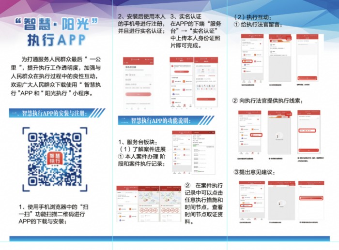 2021年初,“智慧执行”APP正式上线,升级原有的“阳光执行”微信小程序,赋予更加强大的功能于一体,构建案件当事人与执行法官沟通新渠道,实时查看执行进展,办案过程公开透明。对于立案后申请人十分关注的案件进展问题,软件会同步办案系统的节点数据,在软件内的服务台享受以下便捷服务:一是了解案件实时动态。案件当事人可以查看到自己案件进入哪一环节,包括承办法官的办案轨迹、里程和时长,可以公开的执行现场取证内容,财产查控的情况,将流程节点公开,防止承办法官消极执行、选择性执行或慢执行问题,同时便于申请人及时客观的了解被执行人的财产状况,正确理解“执行难”与“执行不能”;二是畅通“对话”渠道,强化执行互动。当事人可以通过APP充分表达新的诉求、提供被执行人财产线索、举报被执行人转移或隐匿财产、法官答疑解惑等需要向执行法官沟通的问题,不用再往返法院奔波。只需点击相应版块留言,内容将实时传输到承办法官业务端和执行指挥中心,针对申请人提出的各类型问题,承办法官将及时处理和答复,执行指挥中心对所有的信息答复和办理情况将进行监管和督办;三是贴切的智能辅助,打造执行公开“百宝箱”。对于不同案情的执行案件,推出”风险评估”(参考)功能,输入基本的案件信息、债务人信息、标的信息,简要回答部分问题,系统会对案件进行初步的风险预判;四是软件还为申请执行人和公众提供全面的其他公开查询业务,包括执行法律法规、执行业务办理规范、执行问答、法院的悬赏公告以及失信被执行人名单查询;五是提供费用计算和天数计算的服务,申请人可以自行查看案件执行天数、计算执行费用、借贷利息、迟延履行利息。