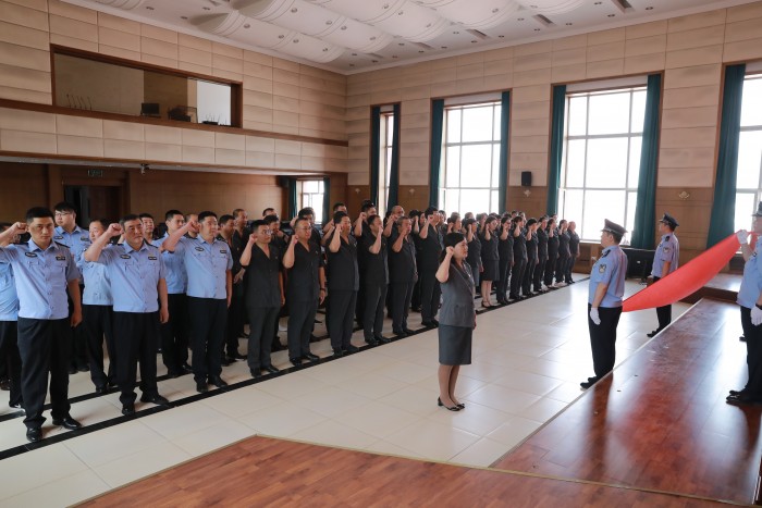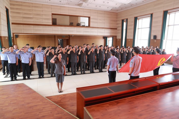 在七楼会议室,奏唱《国际歌》后,党组副书记、常务副院长梁艳杰同志领誓,全体党员干警面向鲜红党旗,握紧右拳,庄严宣誓,铿锵誓言久久回荡,让现场所有党员干警更加牢记自己的誓言,在工作中以人民利益为重,不忘初心、牢记使命,以实际行动兑现对党的庄严承诺。