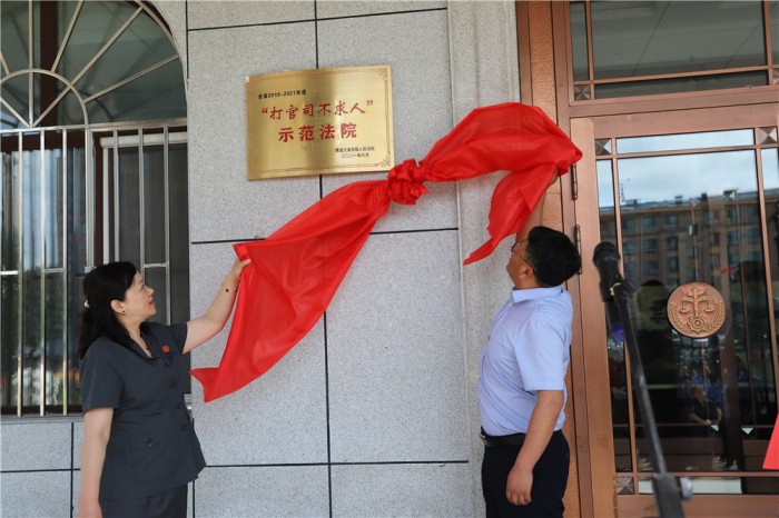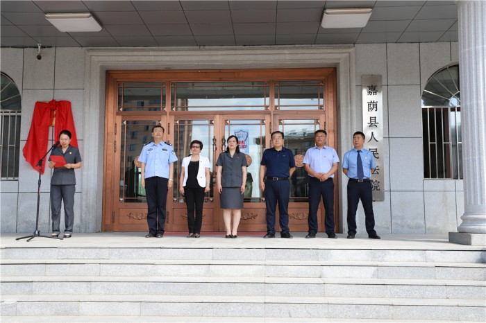 按照省法院同步授牌的工作要求,7月8日上午,伊春市法院党组副书记、常务副院长梁艳杰同志和县委常委政法委书记张仙峰同志共同为嘉荫县法院 “打官司不求人”示 范法院揭牌。嘉荫县人大主任李向东、政协主席董丽、副县长公安局长魏茂玮、县检察院检察长马文军、法院班子成员、全体干警参加仪式。