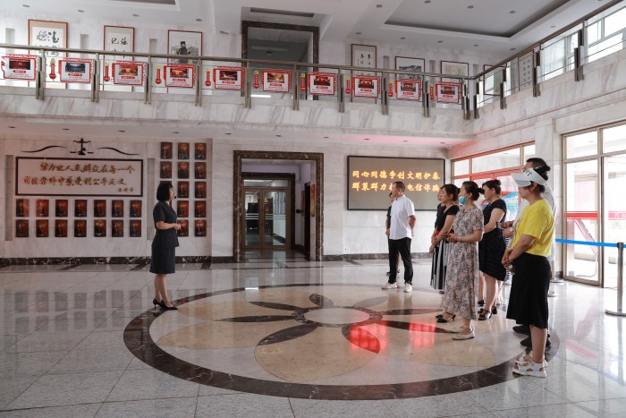 在讲解员的带领下,伊春宝宇房地产开发有限公司员工先后参观了员额法官墙、审判法庭、数字法庭、信访接待大厅、诉讼服务中心、文化长廊、党员之家、文化建设展厅等场所。在七楼会议室员工代表们观看了全国优秀法官、铁林人民法庭副庭长张淑霞的先进事迹宣传片《法官张淑霞》。