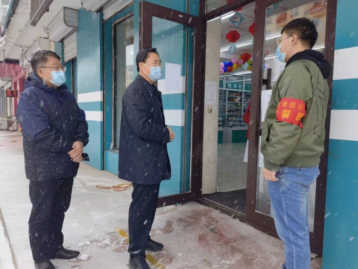 11月8日上午,市中院党组书记、院长韩日强到驻点药店深入了解干警的值守情况,并把组织的关心和关爱及时送到值守干警的心中。韩院长叮嘱干警,一要做好应急处置工作。对测温异常及健康码异常人员,要及时向社区报告,就地临时隔离,等待社区指示。二要做好监督检查工作。对不按照要求扫码测温的人员进行劝返,严格把控第一道防线。三要做好个人防护工作。在值守过程中要注意个人防护和保暖,严格按照防疫要求做好监督协助工作,不脱岗漏岗,圆满完成值守工作。