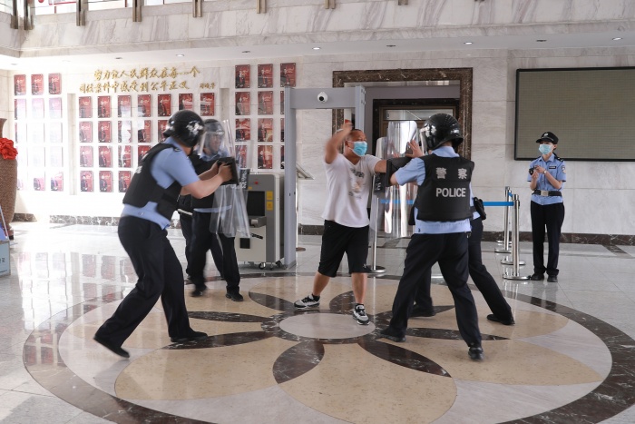 此次演练场景设定为:涉诉人员因对案件不满,在法院安检口接受安检时突然掏刀。突发情况发生时,备勤法警迅速赶往现场采取措施稳控事态,疏导劝离围观人员,对直接闹事人员依法实施控制。整个演练过程紧张有序,达到了“应急调警、快速集结、适时支援、灵活处置”的良好效果。