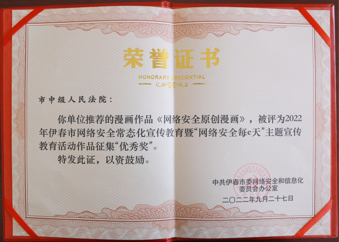 据悉,此次征集共收到作品128个,共评选出2022年伊春市网络安全宣传周作品征集优秀奖24个、入围奖17个,其中市法院宣传处报送的漫画作品《网络安全原创漫画》获得优秀奖,报送的图片作品《共筑网络安全 守护绿色家园》获得入围奖。