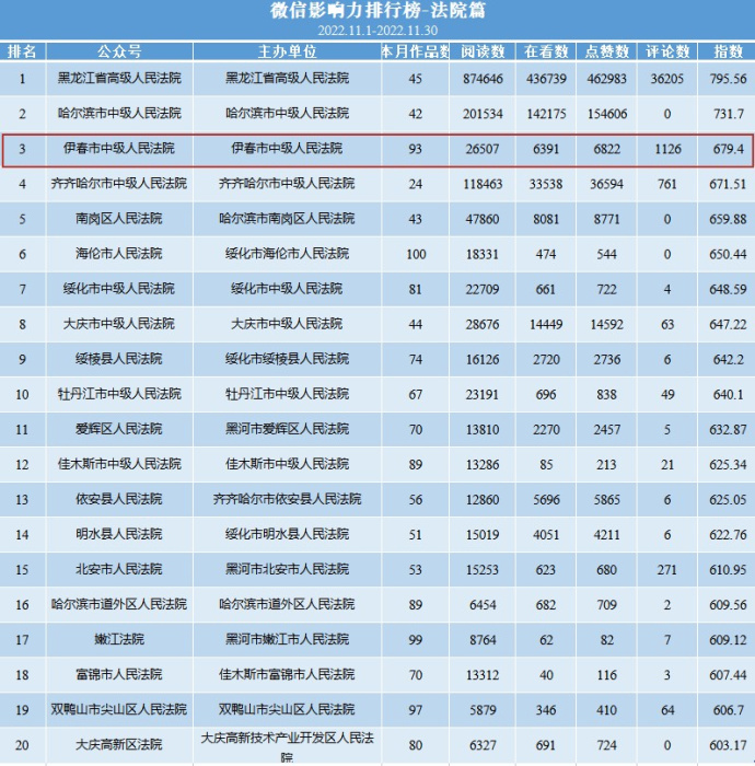再次上榜!伊春中院微信公众号11月份全省法院系统第三名!