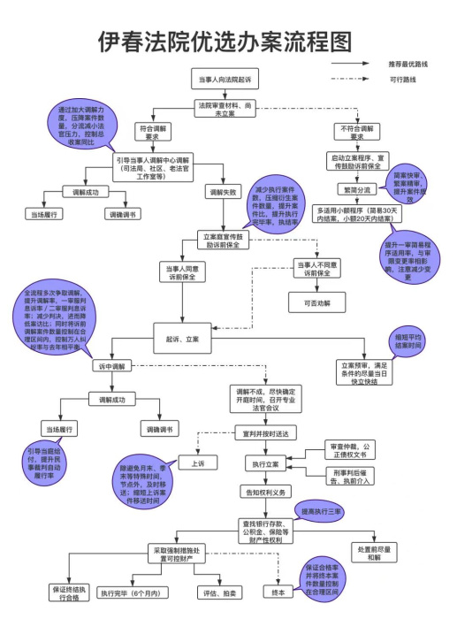 伊春中院对审判流程的各个重要节点环节仔细梳理,充分结合两级法院一线法官的实践经验和意见建议后最终形成了《伊春法院优选办案流程图》,将立案到执行全流程中的各个环节以图表形式展示出来。既是法官办理案件的指南,也是当事人了解案件进展、监督司法公正的窗口,旨在帮助法官明确办案流程、提高工作效率、保障当事人合法权益,实现司法公正与效率的双重提升,有效推动法院工作高质量发展。
