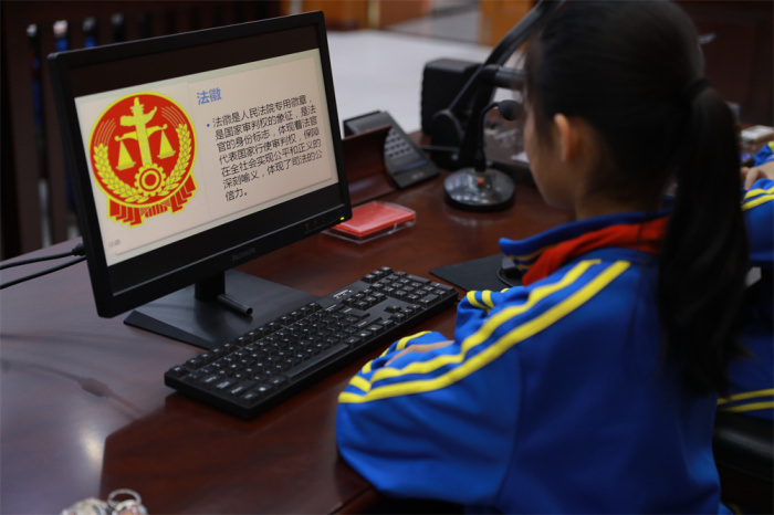 同学们充满好奇地走进法院,依次参观了法官墙、司法之光展板、审判法庭、警务装备室、诉讼服务中心等场所。在审判庭内,讲解员用通俗易懂的语言向学生们讲解了天平、法徽、法槌、法袍所代表的意义并安排他们走上审判台敲响法槌,当了一回 “小法官”,切身感受司法的公正和法律的庄严。