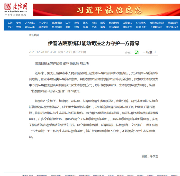 近年来,黑龙江省伊春市人民法院坚决扛起生态环境司法保护政治责任,充分发挥环境资源审判职能,依法审理各类环境资源案件。将修复性司法理念贯穿司法审判全过程,探索以生态修复为中心的环境损害救济制度和多元化生态修复方式,以补植复绿成效、生态修复结果为导向,构建“恢复性司法+社会化治理”协作模式。