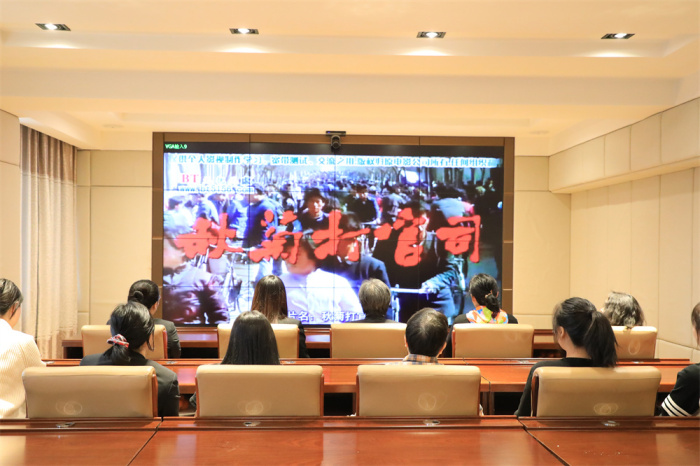 会后,大家在执行指挥中心观看以传递法律意识为主题的电影。