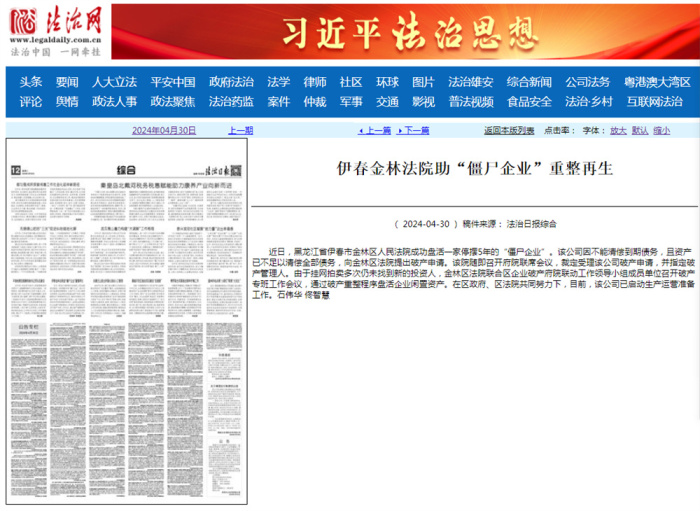 4月30日,《法治日报》报道伊春金林法院助力“僵尸企业”重整再生。