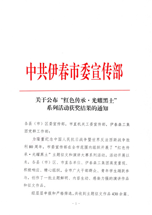 近日,为纪念中国人民抗日战争暨世界反法西斯战争胜利80周年,传承伟大抗战精神,伊春市中级人民法院机关党委积极响应市委宣传部《关于开展“红色传承•光耀黑土”系列活动的通知》要求,组织干警参与主题作品报送。其中,干警黄鑫报送的作品《薪火相传守正义 黑土之上铸法魂》凭借深刻的主题内涵、真挚的情感表达,荣获优秀奖,充分展现了伊春法院干警的精神风貌与责任担当。