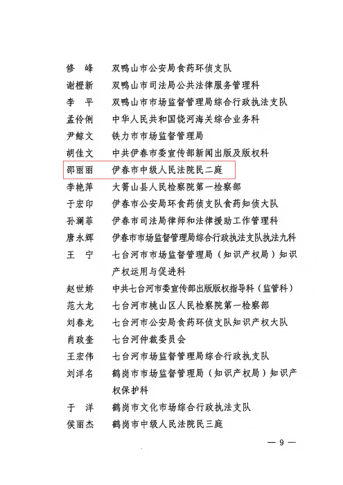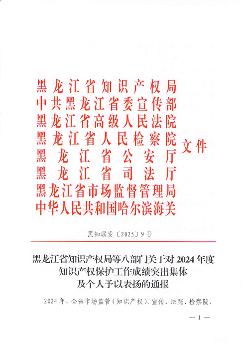 近日,黑龙江省知识产权局等八部门关于对2024年度知识产权保护工作成绩突出集体及个人予以表扬通报,对2024年度全省市场监管(知识产权)、宣传、法院、检察院、公安、司法 行政、海关系统42个先进集体与122名先进个人予以通报表彰。伊春市中级人民法院民二庭副庭长邵丽丽荣获“知识产权保护工作成绩突出个人”荣誉。