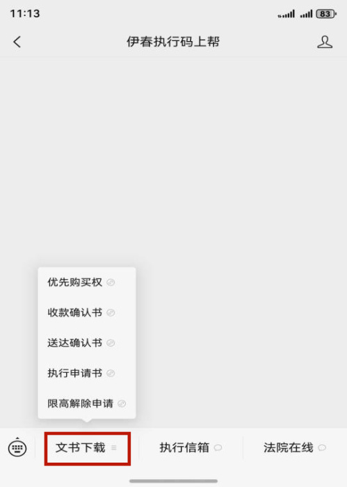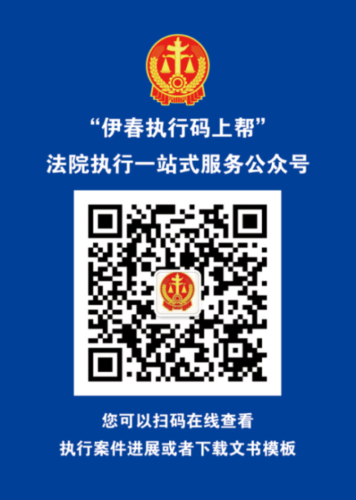 微信搜索“伊春执行码上帮”或扫描下方二维码,点击“关注公众号”即可完成关注。点击菜单栏“文件下载”即可在线查看下载文书。