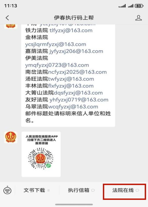 当事人可在公众号菜单栏点击“执行信箱”,获取我市11家法院执行局官方邮箱,将需向法院提交的文书、补充材料等,通过邮箱传至执行局,工作人员每日查看处理。此方式进一步畅通了司法沟通渠道,大大减少了群众往返法院次数。