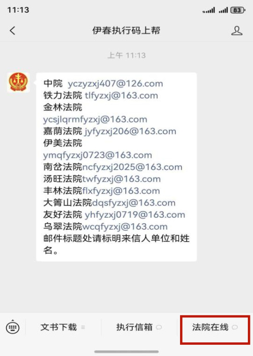 点击公众号菜单栏中“执行信箱”获取法院执行局官方邮箱地址,在线提交案件材料和法律文书。