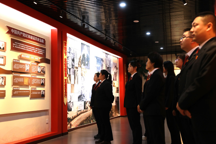 参观行至展厅的结尾处,面向鲜红的党旗,干警们举起右拳,庄严宣誓,铿锵有力的誓言回荡在展厅之中,既是对初心使命的庄严承诺,更是对廉洁司法的坚定表态。