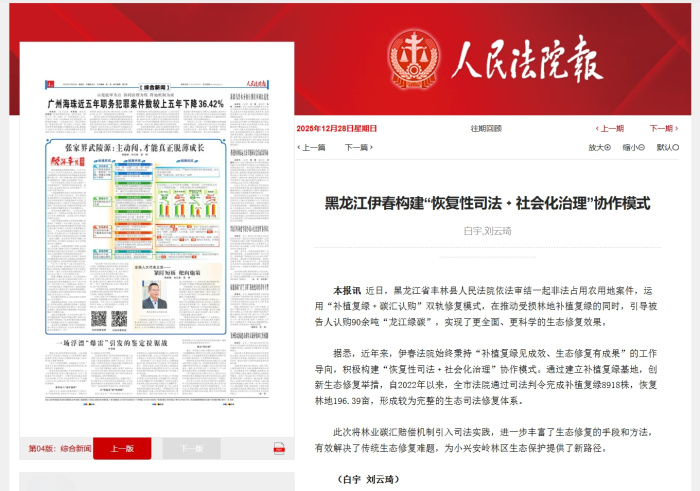近日,黑龙江省丰林县人民法院依法审结一起非法占用农用地案件,运用“补植复绿+碳汇认购”双轨修复模式,在推动受损林地补植复绿的同时,引导被告人认购90余吨“龙江绿碳”,实现了更全面、更科学的生态修复效果。
