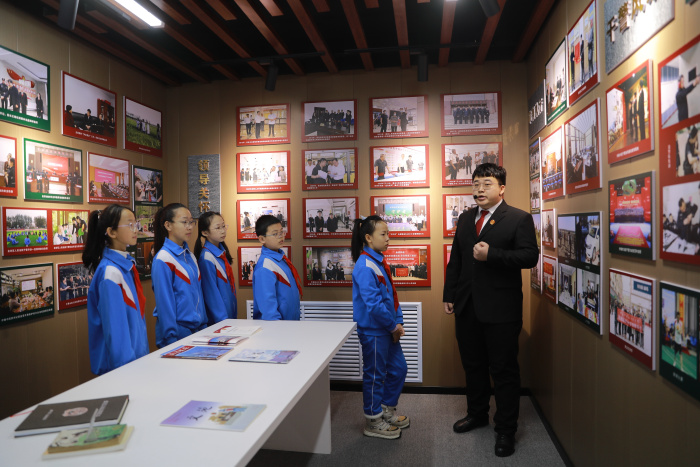 在法院讲解员的引导下,宣讲团成员们循着法治脉络,先后走进审判法庭、院史馆、法治教育基地等核心区域。熠熠生辉的法徽、庄严肃穆的法槌,让孩子们直观感受到司法的权威与厚重;孩子们身着模拟法袍,依次登上审判席,亲手敲响法槌,沉浸式体验庭审全流程,在角色扮演中深化对司法程序的理解。陪同参观的家长们也全程驻足观摩,在沉浸式场景中进一步明晰法院职能,更深刻体会到“青葵法苑”品牌在未成年人法治教育中的独特价值与深远意义。