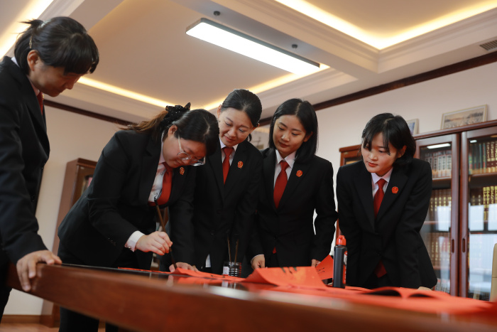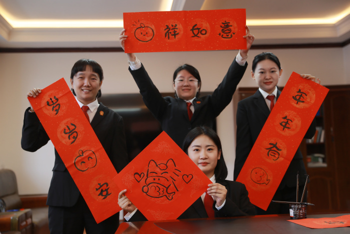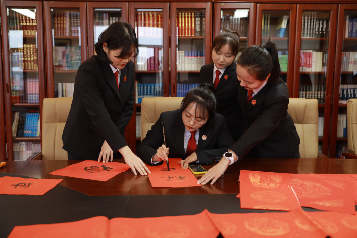 活动现场,红纸铺展,墨香四溢。干警神情专注,挥毫泼墨,一幅幅饱含年味、寓意吉祥的春联和一个个气韵生动的“福”字跃然纸上,传递出了干警对新一年的美好期盼,大家相互交流着春联的意蕴,现场气氛热烈而温馨。