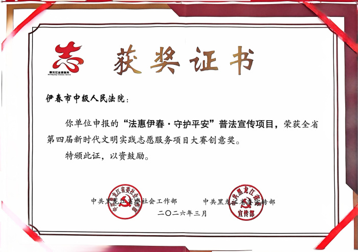 为深入贯彻落实习近平总书记关于志愿服务的重要论述和重要指示精神,大力培育和践行社会主义核心价值观,弘扬“奉献、友爱、互助、进步”的志愿服务精神,伊春市中级人民法院“守护者”志愿服务队申报的“法惠伊春·守护平安”普法宣传项目,在第四届黑龙江省新时代文明实践志愿服务项目大赛中,凭借鲜明的法治特色、务实的服务举措和良好的社会反响,荣获大赛创意奖。
